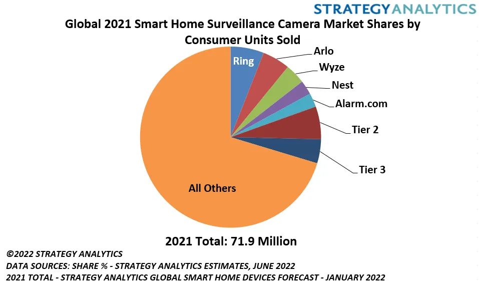 Strategy Analytics近期发布的研究陈述《智能家居监控摄像头全球商场份额- 2022年6月》指出,2021年,亚马逊Ring持续坚持全球监控摄像头商场份额榜首方位。