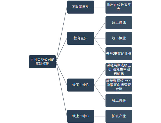 自2020年伊始,各区域连续下发推延开学以及课外训练安排歇业告诉后,数万家教育训练安排以及上千万职业上下游人员便敏捷行动了起来。线下安排需求在正月初的短短几天内处理学员展期交流、线下翻线上部分退费、线下教师学习在线授课技巧等本来需求数月才干完结的使命,而在线安排也需求在各地封城封村的状况下快速发动主讲教师和运营教师来应对出人意料暴增的流量。经分类剖析,各类安排的应对办法首要如下图所示: