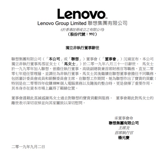 联想独立非执行董事马雪征于 8 月 31 日辞世